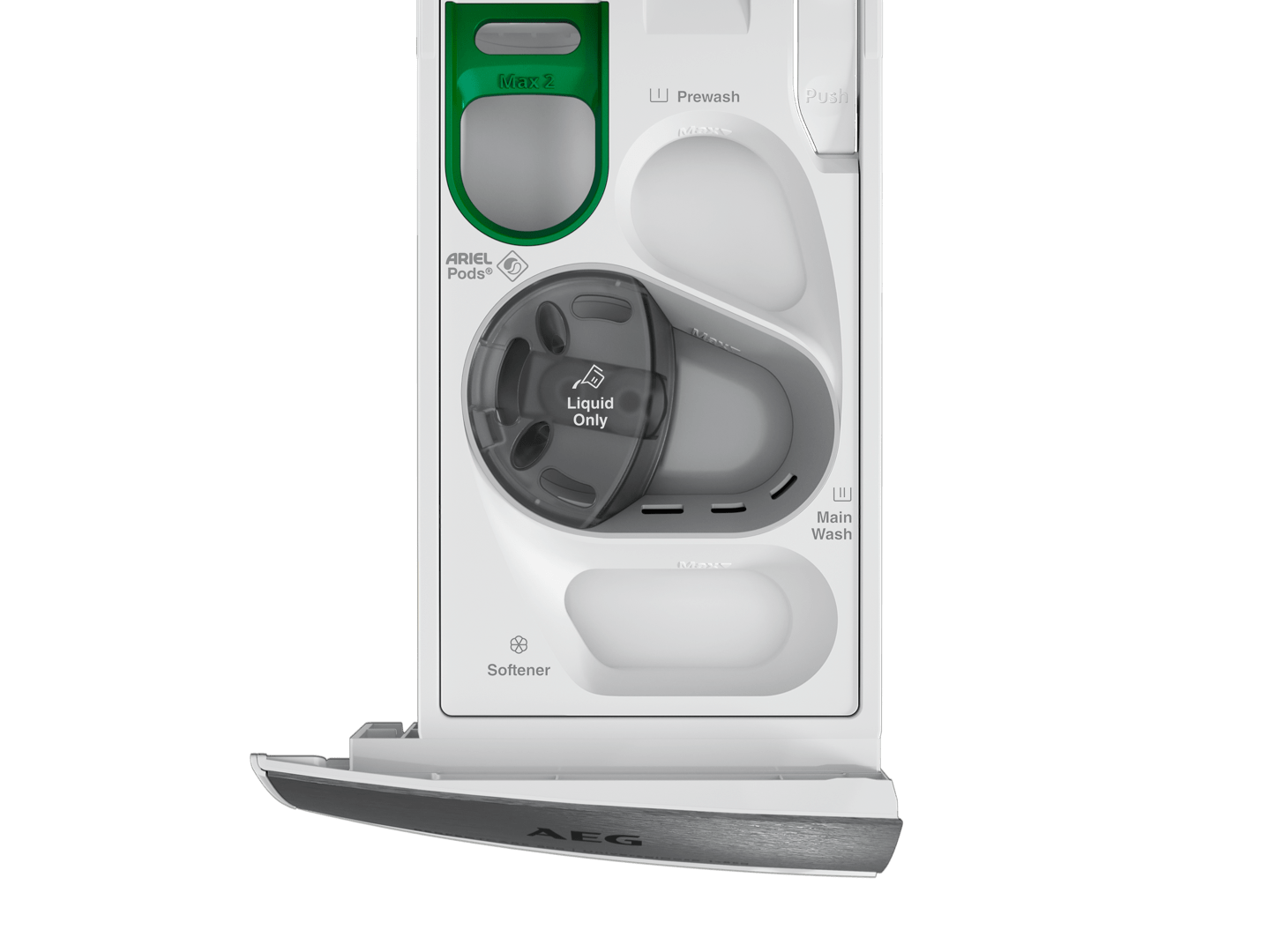 Le nouveau tiroir UniversalDose des lave-linge d’AEG est doté d’une conception brevetée qui permet de dissoudre efficacement tout type de produit de lessive, y compris les PODS®. La puissance de nettoyage du produit de lessive est garantie, même dans les cycles de lavage courts et à basse température.