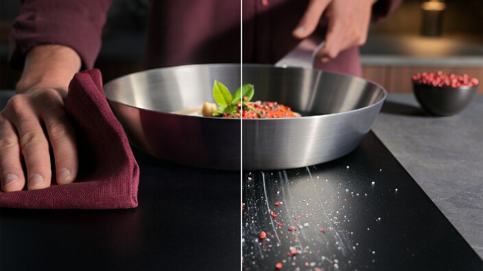 2Fini les traces de doigts !Maintenez l'élégance de votre cuisine avec la surface SaphirMatt®. Sa surface noire mate empêche les traces de doigts, préservant ainsi l'aspect impeccable de votre surface de cuisson tout au long de la journée.