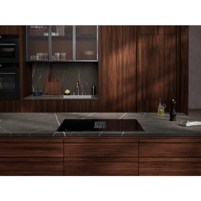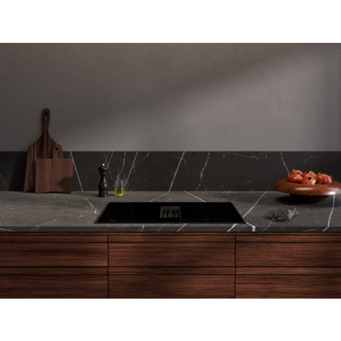 La plaque aspirante Série 6000 Bridge combine une plaque induction adaptée à un encastrement standard dans un meuble de 60 cm, avec une puissante hotte intégrée pour une évacuation optimale de l'air.