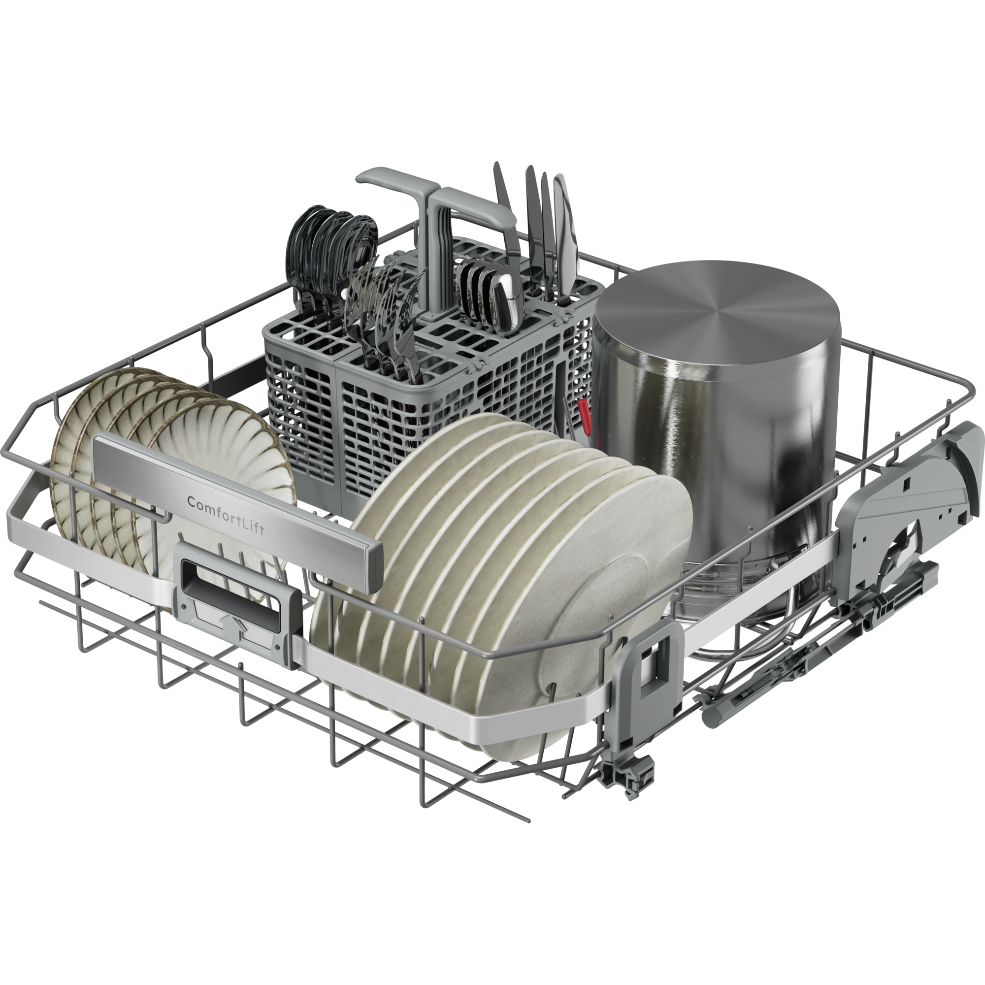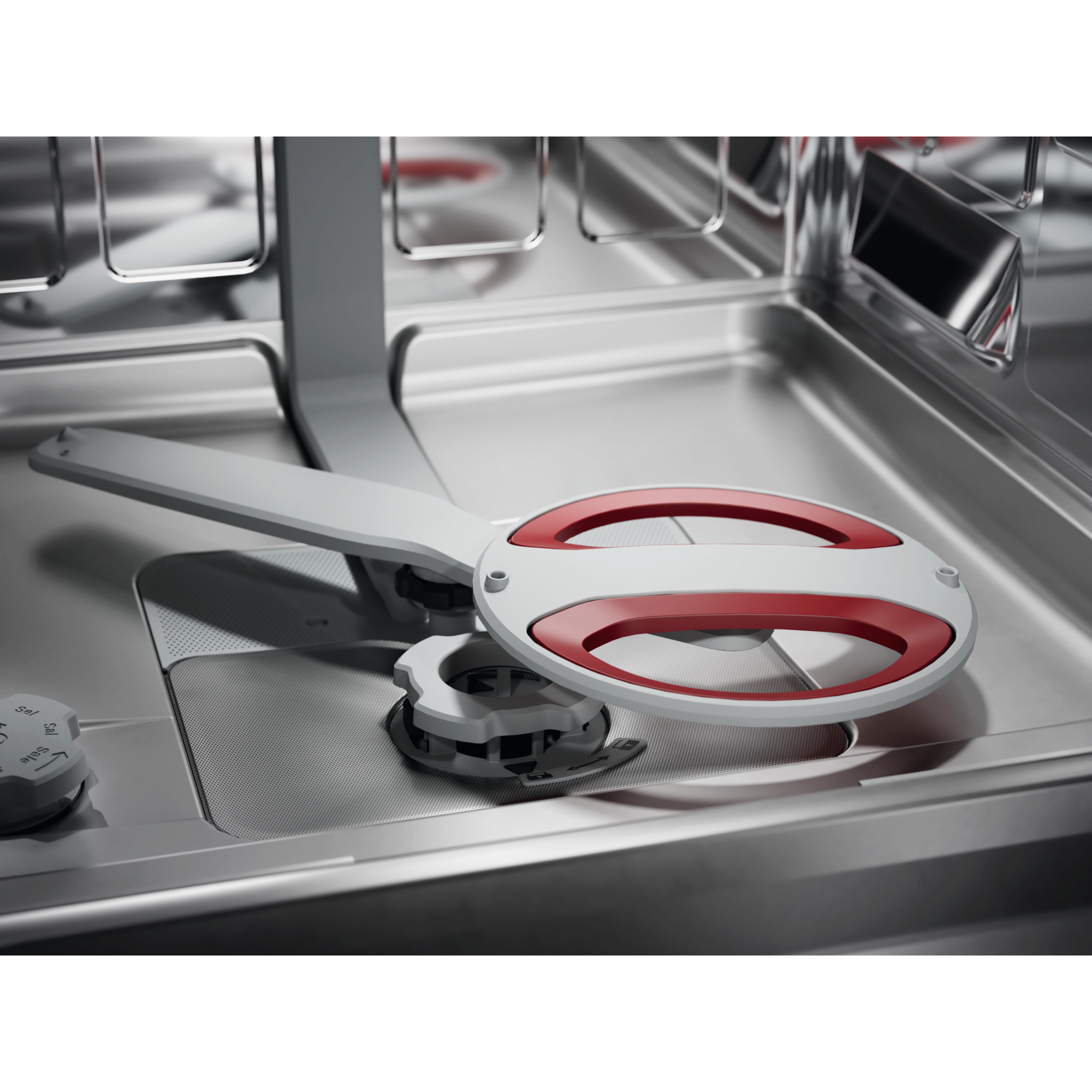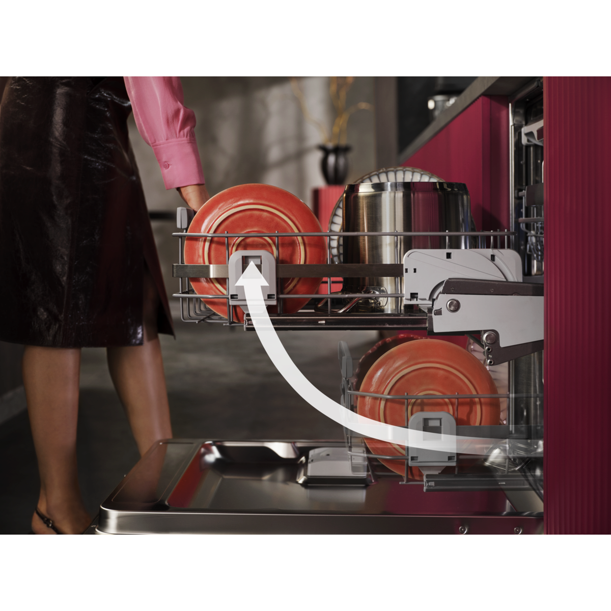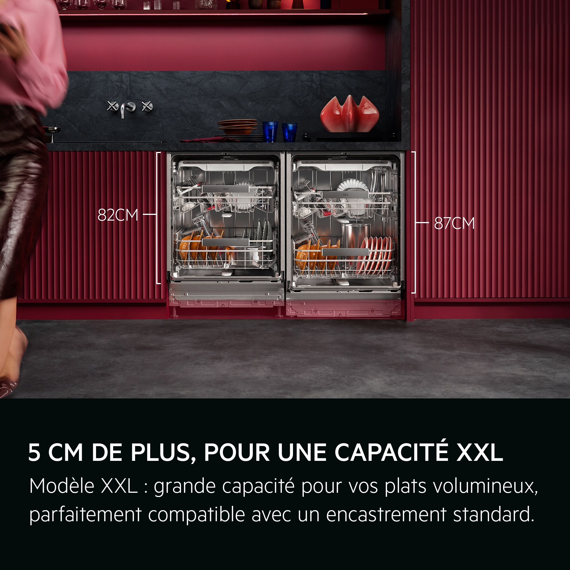 9000 XXL : 5 cm plus haut à l’intérieur mais convient aux meubles de cuisine standards. Paniers multifonctions avec supports pour verres et plaques. Un nettoyage puissant élimine les résidus d’aliments cuits au four. Le système d’eau hautement efficace utilise seulement 8,4 litres d’eau.