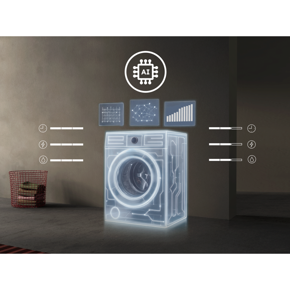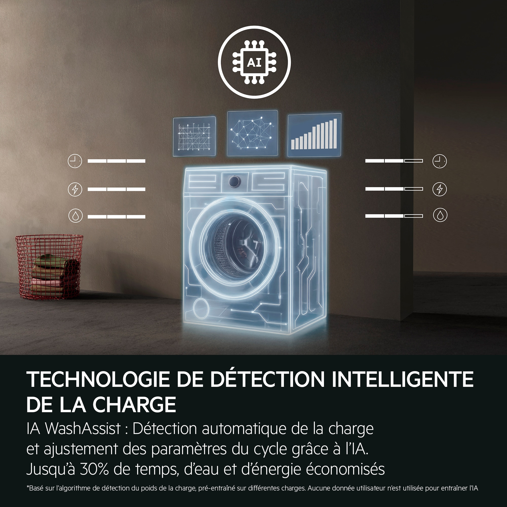 *Basé sur l’algorithme de détection du poids de la charge, pré-entraîné sur des charges. Aucune donnée utilisateur n’est utilisée pour entraîner l’IA. **Test interne sur le cycle Coton 30 °C optimisé avec IA WashAssist, comparant les consommations (temps, eau, énergie) entre 1 kg et charge maximale.