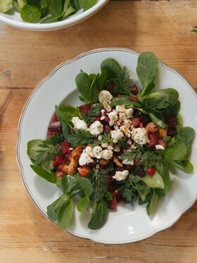 3 petits pains rassis, 2 betteraves, 1 petit oignon, ail, gingembre, romarin frais, sel et poivre, 5 cuillères à soupe d’huile d’olive, 4 cuillères à soupe de jus de pomme, 2 cuillères à soupe de tahini, feta (émietté), 2-3 poignées de fanes